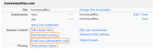 - Edit Contact Info -- Make sure your email address is listed as the administrative contact. The authorization code (sometimes referred to as an EPP code or Domain password) will be sent to that email.