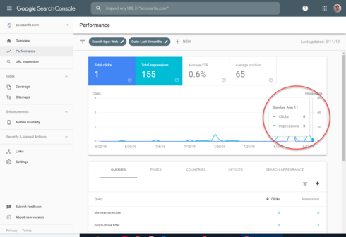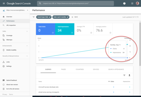 Next, the newer site. Note total impressions are fewer since it is only showing one, the first day, after indexing, whilst the above it the accumulative of many more days (since 6/22):