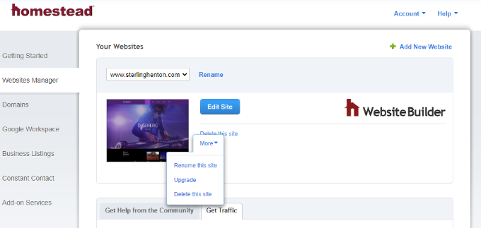 - Click on Websites Manager.(If you have multiple sites, select the one you wish to archive from the drop-down)
