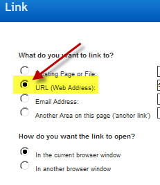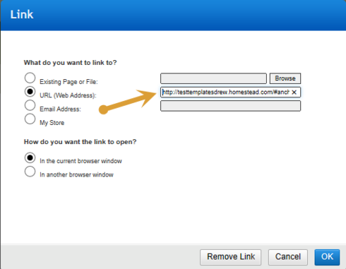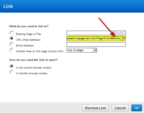 5) Select the 2nd radio button "URL (web address)" and paste the achor link URL into the box.