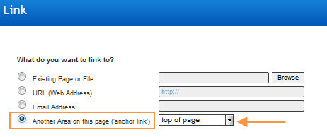 3) In the Link window, choose the 4th option Another Area on this page ("anchor link"). Then, select top of page from the drop-down. Click OK.
